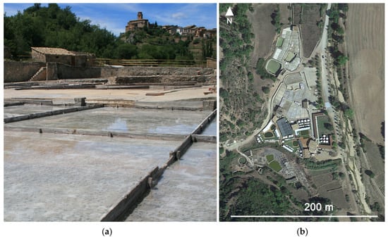 Peralta de la Sal is situated about 30 km southeast of Naval. The saltworks known as El Salinar are located about one kilometer away from this town, on the road leading to Gabasa. Even though the materials that outcrop the lands surrounding these saltworks are mainly Cenozoic gypsum, clay, and marls. The salt originates from Upper Triassic clay and gypsum levels (Keuper), which are found beneath these Cenozoic outcrops [16]. Specifically, salt water was extracted through a well from the Keuper materials. As a consequence of the geology of the area, the Sosa River, which passes near the town of Peralta de la Sal, has a high salinity [11].