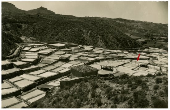 The site chosen for the construction of these saltworks, as mentioned by some geologists as early as the 19th century, was not the most suitable [13]. At that time, frequent flooding resulted from water flowing down the ravine during heavy storms, causing significant damage to the saltworks present in the area. Furthermore, during the 19th century, a public road, which used to lead to a village that no longer exists, traversed a considerable portion of the salt flats, leading to several incidents.