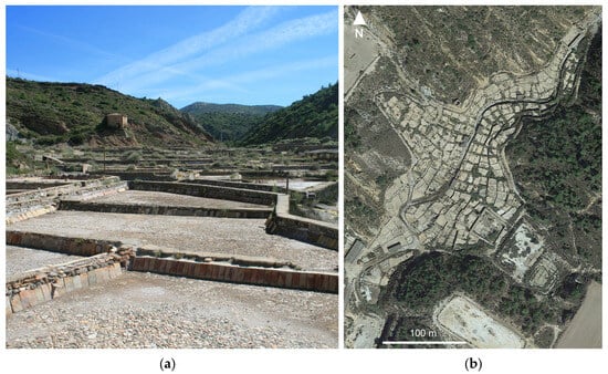 (a) Some of the salt evaporation ponds that are preserved in the area (author: Josep María Mata); (b) Aerial view of Iruelas saltworks.