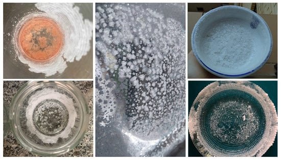 Examples of variables that are involved in the formation of crystals are available space, nature of the substance that crystallizes, the growth rate of the faces, degree of supersaturation, presence of impurities and/or dopants, nutrient supply, temperature and cooling rate, state of agitation, among other environment conditions [72]. In the case of salt crystallization experiments, different variables can be changed to allow obtaining different results (Figure 7). If salt crystals are formed, it can also be relevant to compare them to the different types of salt found in supermarkets, such as table salt or flake salt, using a microscope or hand-lens.
