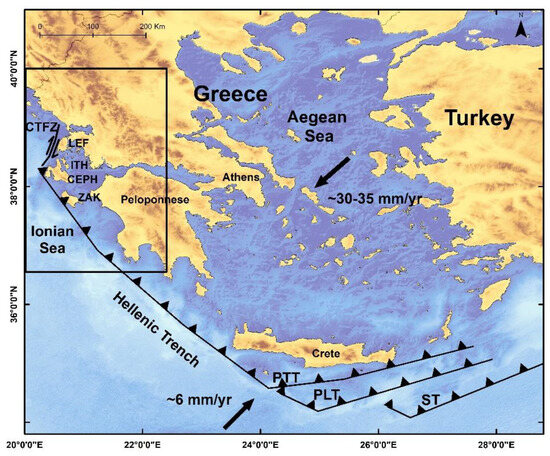 - Scordilis, E.M.; Karakaisis, G.F.; Karakostas, B.G.; Panagiotopoulos, D.G.; Comninakis, P.E.; Papazachos, B.C. Evidence for transform faulting in the Ionian Sea: The Cephalonia Island earthquake sequence of 1983. Pure Appl. Geophys. 1985, 123, 388–397. [Google Scholar] [CrossRef]