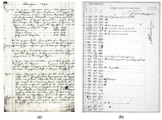 The information sources used in this study are classified into three main groups. The first consists of the little-known diary of D. Kladis written on Zakynthos in the late 19th century [57] (Figure 3a). The second group of information sources consists of the little-known manuscript named “Book of Earthquakes”, as well as of the Zakynthos meteorological bulletin (Figure 3b), both compiled by NOA during the late 19th century. More details about these two sources are provided in the next sub-sections.