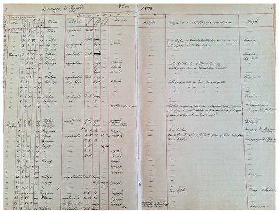 The “Book of Earthquakes” is a two-volume unpublished manuscript [28,29] comprising macroseismic observations collected by local observers affiliated with NOA in several parts of Greece, including Zakynthos, in the time interval from 1893 to 1915. This manuscript has also been utilized in previous studies of Greek historical seismicity, e.g., [63,64]. Dates in the “Book of Earthquakes” are given in the N.S. style. The macroseismic collection was partly published in the “Annales of NOA” from 1893 onward. In this paper, we focus our attention only on earthquakes that caused damage or that have been strongly felt on Zakynthos. Brief macroseismic observations collected by local observers, who serviced the Zakynthos meteorological station of NOA, were also considered. Bulletins of the meteorological station are available from 1 September 1893 onward. These bulletins include meteorological observations collected daily. Moreover, they contain short notes about other phenomena, such as earthquakes felt on the island (e.g., Figure 3b). An example of the earthquakes listed in the NOA’s “Book of Earthquakes” for the year 1893 is illustrated in Figure 4.
