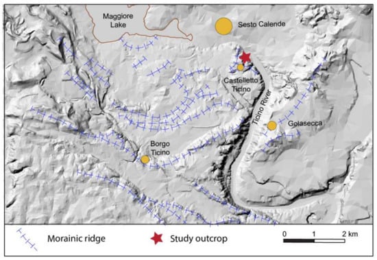 Along the Ticino River, south of Lake Maggiore, three principal frontal moraines have been recently identified []. Each of these moraines is composed of multiple ridges and has been dated to the LGM phase (Figure 1).