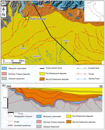In the study area, the main tectonic structures are represented by a northwest verging backthrust, the Gonfolite backthrust, and related splays [,,,]. This structure remains buried under the Plio-Pleistocene deposits of the Po Plain related to the Miocene tectonic events that led to the emplacement of the outermost South Alpine forethrusts [,,]. In correspondence to the southern termination of Lake Maggiore (Figure 1), a set of minor thrusts and backthrusts has been identified by Fantoni and Bello []. These faults are rooted in the Mesozoic carbonates and displace up to the top of the Mesozoic Carbonates. Then, these faults were covered by the Oligo-Miocene clastic wedge of the Gonfolite Formation (Figure 3a,b).