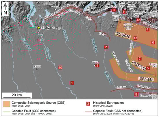 In the study area, there are no seismogenic faults reported in the Database of Individual Seismogenic Sources (DISS) (Figure 4 []). Furthermore, the Parametric Catalogue of Italian Earthquakes (CPTI []) does not contain any historical earthquake records coinciding with or in close proximity to the study area. The nearest reported earthquake event (13 December 1918, Pianura Lombarda, Mw = 4.62; see also Table 1) is represented by a report with I = 3 in Varano Borghi village, located a few kilometers NE of the study outcrop. Additionally, the ITHACA database of capable faults [] does not show capable faults in the study area. The nearest one, the Monte Campo dei Fiori–Varese fault, has its westernmost lateral tip approximately 8 km far from the studied outcrop (Figure 3) and it is classified as “Composite Seismogenic Source not connected”, i.e., not related to a potential seismogenic fault.