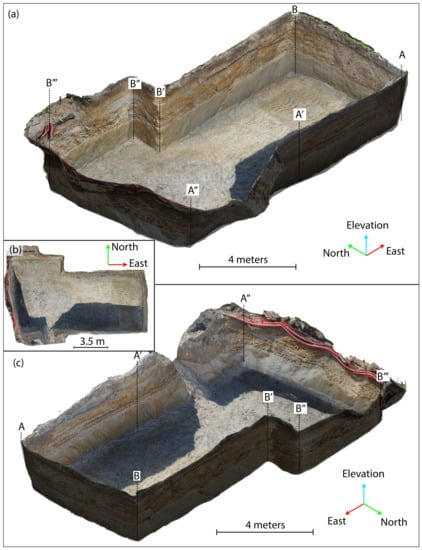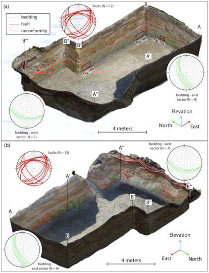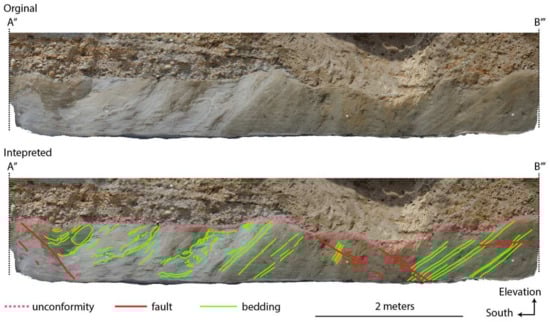 Orthographic and frontal view of the west wall of the trench (section A′′-B′′′) where the red and green lines and the pink dashed line represent the faults, bedding, and unconformity, respectively. This section shows that, as we move toward the SW corner of the trench (section limit A″), the bedding becomes less defined and irregular, showing some slumping structures. Moreover, it is possible to see that, in the northern part of the section, the morphology of the unconformity surface is influenced by the presence of two faults (that are cut by the unconformity). See Figure 5a for the section position.