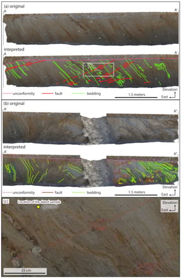 Orthographic and frontal views of the south wall; the red and green lines and the pink dashed lines represent the faults, bedding, and unconformity, respectively. (a) The section A-A′ shows that the fault cuts and displaces the slumping structures with apparent inverse offset beds. (b) The section A′-A″ shows that, as you move toward the SW corner of the trench, the slumping structures become more complex. In both sections, the horizon above the unconformity was removed for a better representation. See Figure 5b and Figure 7b for the section positions. (c) Details of faults cutting the slumping structures and location of the sample dated via 14C radiocarbon.