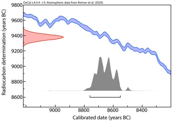 - Reimer, P.; Austin, W.; Bard, E.; Bayliss, A.; Blackwell, P.; Bronk Ramsey, C.; Butzin, M.; Cheng, H.; Edwards, R.L.; Friedrich, M.; et al. The IntCal20 Northern Hemisphere Radiocarbon Age Calibration Curve (0–55 cal kBP). Radiocarbon 2020, 62, 725–757. [Google Scholar] [CrossRef]