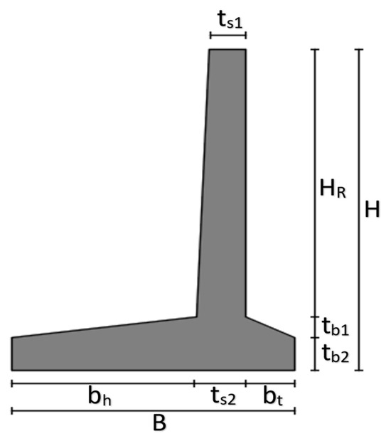 Schematic view of the retaining wall, where H is the wall height; HR is the stem height; tb2 is the base thickness at the edges; tb1 + tb2 is the base thickness at the stem joint; B is the base width; bh is the heel width; bt is the toe width; ts1 is the stem top thickness; and ts2 is the stem base thickness.