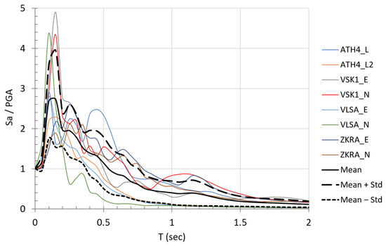 In order to estimate the seismic response of the three wall models, eight real acceleration time histories from five different seismic events were selected, as the strongest seismic motions of the Hellenic database recorded on rock conditions (Margaris et al., 2021 [25]) (Table 5). The normalized acceleration response spectra of the selected records, as well as the mean normalized spectrum ± one standard deviation, are presented in Figure 4. Aiming to correlate the induced displacements with the increasing seismic intensity under free field conditions, the input time histories were scaled to PGA values equal to 0.1 g, 0.2 g, 0.3 g, 0.4 g and 0.5 g. The upper scaling limit of PGA = 0.5 g has been chosen as a probable seismic intensity level in Greece, and precisely in the Region of East Macedonia and Thrace, according to seismic hazard maps proposed in the work of Sotiriadis et al. (2023) [26]. Therefore, 600 dynamic analyses (3 retaining wall models × 40 input motions × 5 initial conditions) and two additional sets of 40 2D soil response analyses were carried out to estimate the values of seismic intensity measures under free field conditions, considering and ignoring the presence of water table, respectively. It should be noted that the aim of this work is the proposal of fragility curves that have a broad implementation area and can be subsequently utilized in conjunction with seismic hazard analysis results concerning specific sites, in order to estimate seismic risk of the corresponding areas. Therefore, record selection was not performed based on spectrum compatibility, as this would have led to limitations regarding the site applicability of the proposed fragility curves. Instead, real acceleration time histories recorded on rock conditions were selected and scaled, following the incremental dynamic analysis method. A similar approach regarding ground motion selection has been followed in the literature by Che et al. (2020) [27], Zamiran and Osouli (2018) [12], and Lesgidis et al. (2017) [28].