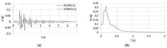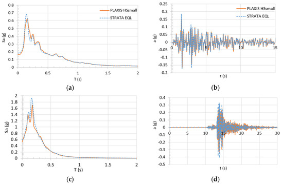 Subsequently, a comparative evaluation of soil response was carried out adopting the equivalent linear approach in STRATA and the non-linear HSsmall constitutive model in PLAXIS. To account for the hysteretic behavior of soil during the seismic loading in the equivalent linear analyses, shear modulus reduction and damping curves of Darendeli and Stokoe (2001) [30] were utilized. Figure 7 shows the response spectra and acceleration time histories at the ground surface, as obtained from the equivalent linear and non-linear analyses, by applying the input motions ZKRA_N (PGA = 0.0571 g), and VLSA_E (PGA = 0.1998 g). Since the deviations of the equivalent linear and non-linear approach depend on the degree of non-linearity of the soil, it is concluded that the PLAXIS 1D-wave propagation results show satisfactory convergence with those of STRATA, and therefore the validity of the soil simulation using the HSsmall constitutive model is verified.