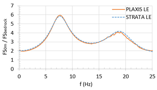 Comparative representation of transfer function results derived from the 1D linear elastic analyses performed by PLAXIS and STRATA, by applying the seismic motion ATH4_L2.