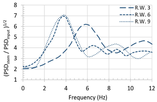 The root mean square of the power spectral density ratios, demonstrated the fundamental frequencies of the three retaining wall models, at 6 Hz for R.W.3, and around 4 Hz for the cases of R.W.6 and R.W.9. These results are depicted in Figure 8, for the input motion VSK_N scaled at a value of PGA equal to 0.1 g.
