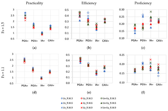 Plotted rankings of practicality, efficiency, and proficiency criteria, in terms of permanent horizontal displacement of the wall base Ux, permanent vertical displacement of backfill Uy, and combining Ux + Uy (a–c) Regarding the case of Fs = 1.5 initial condition; (d–f) Regarding the case of Fs = 1.1 initial condition.