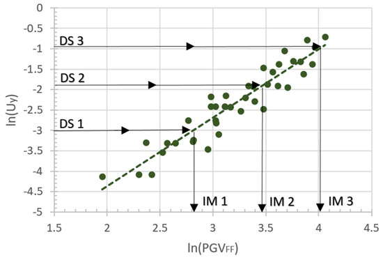 The implementation of the lognormal cumulative distribution function requires the estimation of the median threshold values for the three damage states, as well as the total lognormal standard deviation βtot. The median threshold values , were estimated for each damage state by the plots ln(IM) − ln(DI) that describe the evolution of damage with the increasing ground motion intensity. In Table 9, the values of and βtot are indicatively presented for the three cases of Fs = 1.5, 1.3, and 1.1, concerning the intensity measure PGAFF and the three damage indices, while Table A1, Table A2, Table A3, Table A4 and Table A5 in Appendix A include the fragility function parameters regarding all five initial conditions, in terms of PGAFF, PGVFF, and CAVFF, and Ux, Uy, and Ux + Uy. Figure 10 shows the case of R.W.6 for Fs = 1.2, considering the permanent vertical displacement of the backfill as damage index and the free field PGV as intensity measure. It should be noted that in cases where the calculated displacements were not sufficient to cause extensive damage, the linear relationship was extrapolated [13]. The uncertainties associated with the damage states can be addressed utilizing the maximum likelihood method, as presented in the work of Karakas et al. (2022) [31]. In this work, the values of the uncertainties and were set equal to 0.4 and 0.3 according to HAZUS (2004) [8]. The coefficient of uncertainty that expresses the deviation of the structure’s response at each intensity level due to the different input motions (, was calculated as the root mean square error of the differences between the damage index values predicted by the linear regression line, and the observed values that resulted from the dynamic analyses.