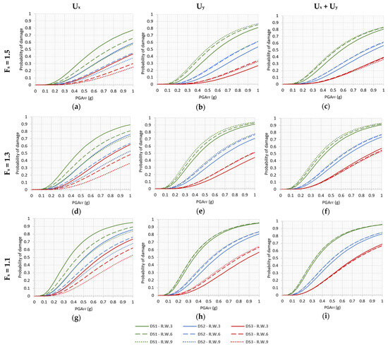 Fragility curves for different initial conditions regarding the value of Fs = 1.1–1.5, in terms of PGA − Ux, for the cases of (a) R.W.3 − DS1; (b) R.W.3 − DS2; (c) R.W.3 − DS3; (d) R.W.6 − DS1; (e) R.W.6 − DS2; (f) R.W.6 − DS3; (g) R.W.9 − DS1; (h) R.W.9 − DS2; (i) R.W.9 − DS3.