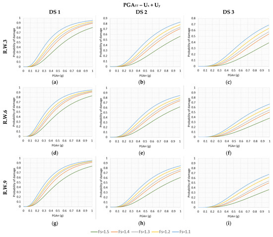 Based on the implementation of the computed fragility curves parameters, IMmi, concerning the three damage states, and βtot (Table 9, and Table A1, Table A2, Table A3, Table A4 and Table A5 in Appendix A) to the lognormal cumulative distribution function (Equation (4)), the probabilities of exceeding each damage state for a given level of seismic intensity were calculated. Hence, the corresponding fragility curves for the three models R.W.3, R.W.6, and R.W.9 were proposed, referring to the five cases of initial conditions defined by the different values of global Fs. Figure 11 illustrates the fragility curves for Fs = 1.5, 1.3, and 1.1, in terms of PGAFF − DIs, while the fragility curves regarding all five initial conditions, in terms of PGAFF, PGVFF, and CAVFF, and Ux, Uy, and Ux + Uy, are illustrated on Figure A1, Figure A2, Figure A3, Figure A4 and Figure A5, in Appendix B.