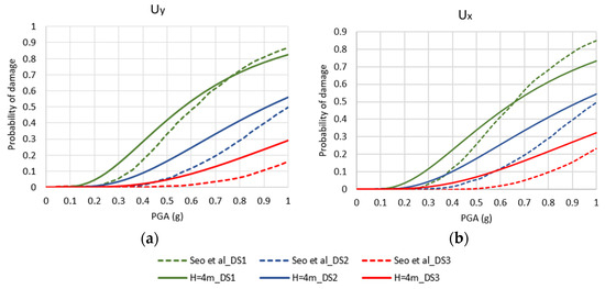 Comparative representation of the fragility curves by Seo et al. [14] and the proposed curves of this study, in terms of (a) PGAFF − Uy; (b) PGAFF − Ux.