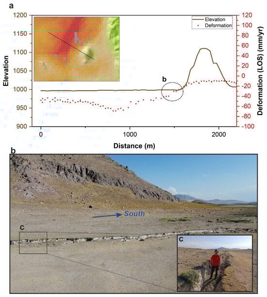 Figure 8b shows an image taken from an unmanned aerial vehicle and topographic/deformation profiles of the N–S-oriented surface fissures and scarps examined in the Adakale/Karapınar region in August 2023. This site is associated with the eastern margin of the Konya Lake graben, controlled by a N–S-striking and west-dipping normal fault system, whose main strand runs next to Adakale village. The topographic profile traverses a 120 m-high andesite hill in the east, and the piedmont to the west is underlain by basin-fill alluvium. These scarps–fissures, which are up to 500 m long, are parallel to the basin margin fault and show a westward vertical displacement of up to 2 m, consistent with the normal fault system that controls the margin of the graben and thickness variations in the basin fill (Figure 8b). InSAR data indicate that land subsidence is restricted to the area underlain by alluvium, reaching values of −80 mm/y in LOS, whereas no displacement was recorded on the hill with exposed bedrock. These surface ruptures are compatible with differential compaction controlled by sharp lateral changes in the overburden thickness, likely governed by concealed normal westward faults.