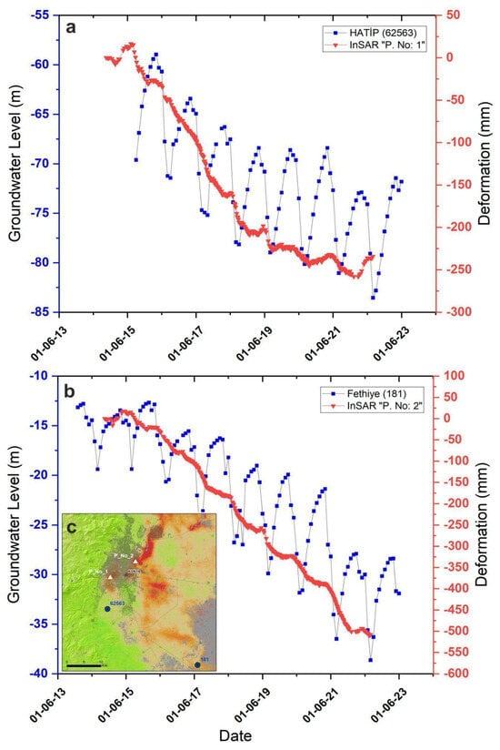 LOS deformation time series of the eastern and western sectors of Konya city (red lines). Graphs of the temporal variation in groundwater level at Hatip (a) and Fethiye (b) stations (blue lines). Note the seasonal variations superimposed on the general decreasing trend. (c) The white triangles represent subsidence points and the blue circles represent groundwater wells.
