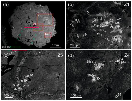 - Nasdala, L.; Kronz, A.; Hanchar, J.M.; Tichomirowa, M.; Davis, D.W.; Hofmeister, W. Effects of natural radiation damage on backscattered electron images of single crystals of minerals. Am. Mineral. 2006, 91, 1739–1746. [Google Scholar] [CrossRef]