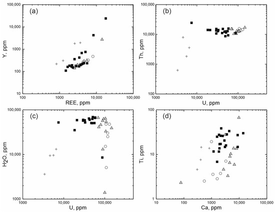 - Peretyazhko, I.S.; Savina, E.A. Tetrad effects in the rare earth element patterns of granitoid rocks as an indicator of fluoride-silicate liquid immiscibility in magmatic systems. Petrology 2010, 18, 514–543. [Google Scholar] [CrossRef]