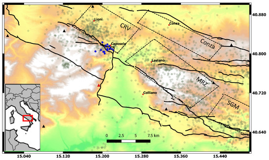 The region under study presents a complex structure, inherited by the different phases of rifting, drifting and shortening that deformed the Corsica–Sardinia and Adriatic–Apulian forelands during the Meso-Cenozoic era [20,50,51,52]. During Quaternary, the Southern Apennine thrust belt was dissected by NW-SE-oriented normal faults that accommodated an extensional tectonic phase, which is still ongoing [53]. The tectonic of the Irpinia region is currently characterized by active, extensional faults arranged in subparallel structures, mainly disseminated over the Apennines axial sector, with trends mainly ranging from WNW-ESE to NW-SE [19,20,21].