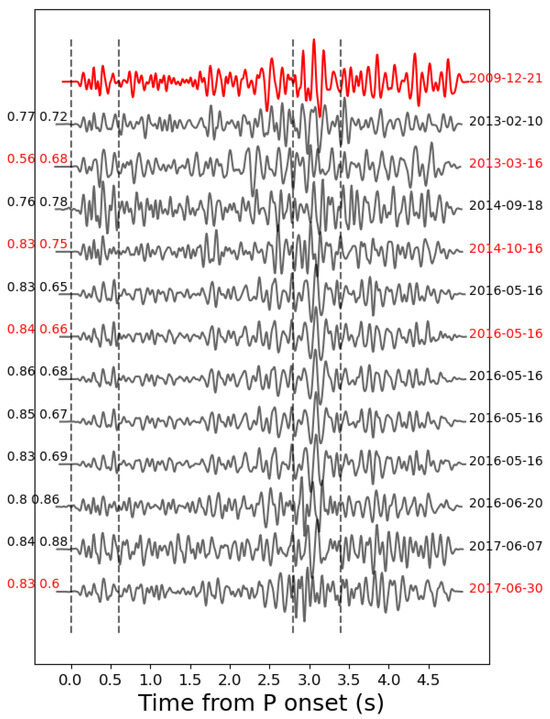 In Figure 2, the signals (vertical ground motion component) of the earthquakes of SET-REP are displayed. At the top of the figure, EV-M is plotted (red line). All amplitudes are normalized, in that the maximum amplitude of each earthquake plotted in the figure is made equal to one. On the right, the occurrence time of the earthquake is shown; in red, the events belonging to SET-CL are indicated. On the left, the CC values for the P and S phase between each event and EV-M are displayed. The dotted vertical lines mark the time windows adopted for the calculation of the CC for P and S phases. Events belonging to a seismic sequence are visible on 16 May 2016, when five events occurred on the same day.