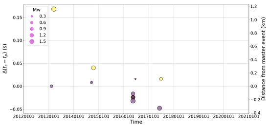 Using Equation (8), estimates of the intra-hypocenter distances were thus inferred. These values are plotted in Figure 3 (right y scale) as a function of time. On the same plot, each point is referred also to the corresponding . It was found that all solutions but one have in the range of (−0.05 s:+0.05 s), which corresponded to a within m from the hypocenter of EV-M. Noteworthy, only one event, belonging also to SET-CL, showed a larger corresponding to about 1.1 Kkm from EV-M, suggesting that this event was originating from a different fault domain than the rest of the events of SET-REP.
