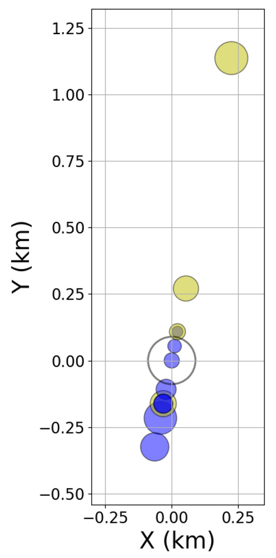 In Figure 4, the relative positions of the events of SET-REP with respect to EV-M are shown. The markers have a radius equal to the asperity size estimated above. Yellow dots also mark events in SET-CL. The empty circle shows the position and the fault size of EV-M. The epicenters of the events of SET-REP were fictitiously located on the map along the line connecting the reference station and the epicenter of EV-M. All events of SET-REP except one (that belongs to SET-CL) were apparently generated on a common fault domain of ∼500 m with partial overlap of the slipping areas. This result suggests that the volume identified in Palo et al. [18] generating clusters of near-repeaters could be further segmented into smaller sub-domains.