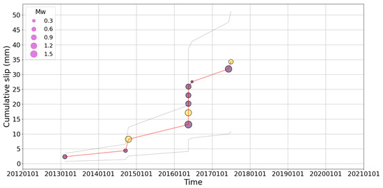 In Figure 5, the co-seismic slip integrated over time (cumulative slip) is shown as a function of time. Here, the slip was computed assuming the same stress drop of 4 MPa for all the equal events. Please note that in the latter plot, the event of SET-REP (and SET-CL) with a large was removed to not mix up the contributions from clearly disjointed slipping patches. The yellow dots mark the events belonging to SET-CL, too; the marker size scales with the magnitude. A quite irregular occurrence of repeaters over time can be noted; in fact, the events of SET-REP occurred mostly as doublets or swarm/sequence, as in the case of the group of events in 2016. The cumulative slip for the average stress drop value was about 35 mm, and groups of repeaters occurred every 1.2–1.8 years. Given the variability in stress drop of the events of SET-CL mentioned above, the cumulative slip was also computed using the boundary values of stress drop of 0.7 MPa and 7.3 MPa. The slip corresponding to these solutions integrated over time is shown with gray lines in Figure 5. The cumulative slip for these boundary solutions was equal to about 10 mm and 50 mm, respectively, for the lower and upper stress drop bound. Remarkably, the cumulative slip computed using the mean stress drop value decreased to about 21 mm (ranging 6–33 mm including the stress drop uncertainty) if the aftershocks of the 2016 sequence were discarded assuming they were triggered by local stress re-distribution after the mainshock.