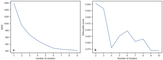 (a) Elbow plot and (b) silhouette score for the optimum number of clusters selection for k-means clustering model.