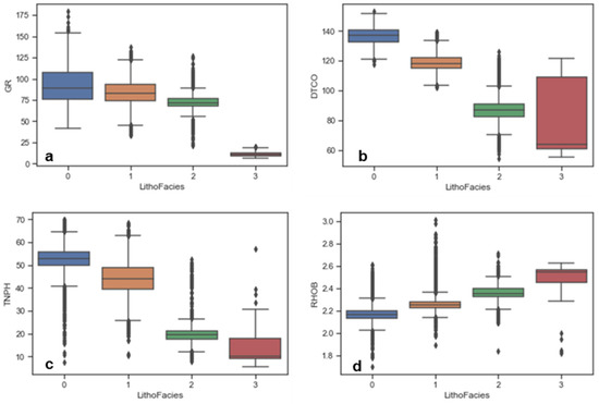 Boxplots showing the distribution of petrophysical parameters—(a) Gamma ray (GR, Api), (b) Compressional wave velocity (DTCO), (c) Thermal neutron porosity (TNPH, %), and (d) Bulk density (RHOB)—across four clustered lithofacies categories.