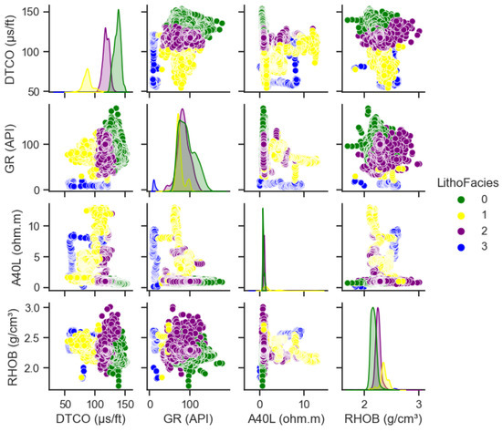 Given the absence of mineralogical or facies data in the dataset, boxplots of key petrophysical parameters (GR, DTCO, TNPH, and RHOB) in relation to clustered lithofacies are shown in Figure 3. The low porosity and reduced GR readings of Facies 2 and 3 suggest carbonate formation. Field experience showed a higher frequency of limestone than dolomite, leading to the identification of Facies 2 as dolomite and Facies 3 as limestone. The differentiation of the other lithofacies was based on GR and DTCO log analyses. Higher GR readings in Facies 0 than in Facies 1 indicated shale, a conclusion supported by the increased travel time observed in the DTCO logs for shales. Similarly, Figure 4 presents a series of cross-plots comparing different petrophysical properties from a dataset, with each plot showing the relationship between two properties. The data points were color-coded based on lithofacies classification, indicating four distinct categories. Marginal histograms on the axes of each plot highlight the distribution of the individual properties.