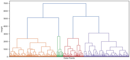 The hierarchical clustering methodology is tested using four linkage criteria: single, complete, average, and Ward’s linkages. After analyzing the dendrogram structures, cluster cohesion, and separation, the Ward linkage method was selected. This method, notable for its emphasis on minimizing within-cluster variance, resulted in a clear dendrogram that suggested the existence of four distinct clusters, consistent with the k-means clustering results (Figure 5).