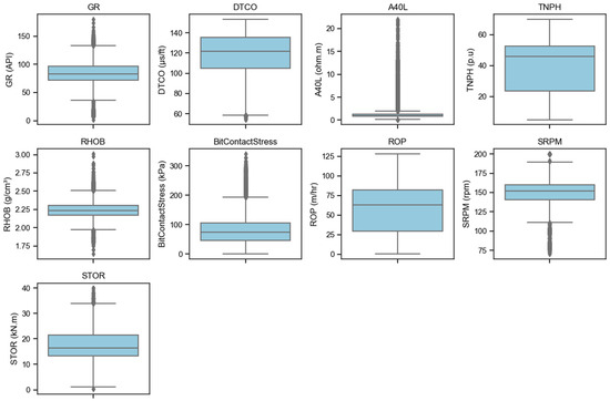 Graphical representations such as boxplots and scatterplots were used for each input parameter to identify any outliers in the dataset. The analysis demonstrated that the maximum values of GR, ROP, and porosity should not exceed 200 API, 150 m/h, and 70%, respectively. For drilling parameters, BitContactStress, RPM, and STOR values should be greater than 0.1 kN/m2, 10 RPM, and 0.1 kNm, respectively. Figure 6 presents boxplots of all the input parameters used for clustering and classification. Once the outliers of the input parameters were removed, the next step was to scale them to ensure that they all had an equivalent range to enhance the convergence rate and effectiveness of the developed algorithms.