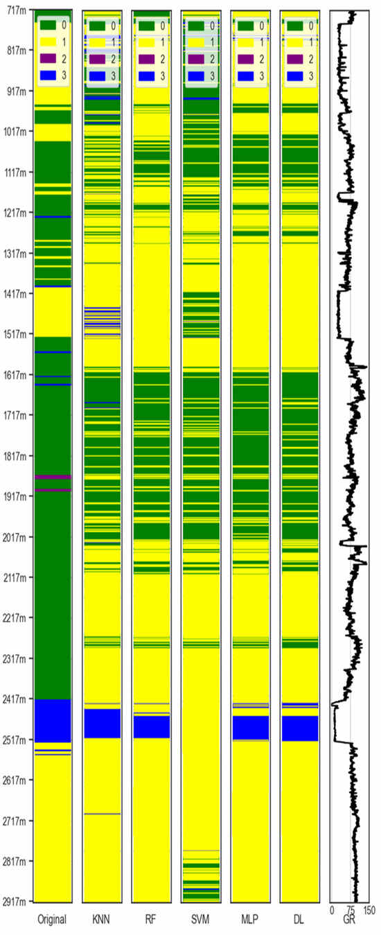 Lithofacies classification from manually labeled data and GR of the blind–test well (graph in the last column). The leftmost column shows the original lithofacies from the blind–test well, and the other columns represent classifications by KNN, RF, SVM, ANN, DL, and GR models lithofacies predictions.
