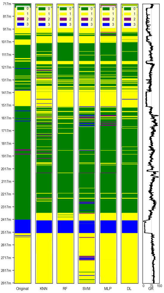 Lithofacies classification using k-means clustering followed by ML models and the GR of the blind–test well. The leftmost column shows the original lithofacies from the blind–test well, while the other columns represent lithofacies prediction classifications by KNN, RF, SVM, ANN, and DL models.