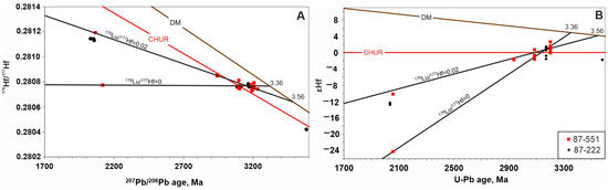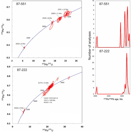 - Bibikova, E.V.; Claesson, S.; Fedotova, A.A.; Stepanyuk, L.M.; Shumlyanskyy, L.V.; Kirnozova, T.I.; Fugzan, M.M.; Ilinsky, L.S. Isotope geochronological (U–Th–Pb, Lu–Hf) study of the zircons from the Archean magmatic and metasedimentary rocks of the Podolia Domain, Ukrainian Shield. Geochem. Int. 2013, 51, 87–108. [Google Scholar] [CrossRef]