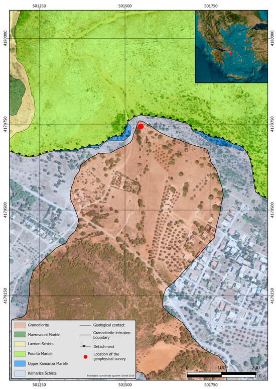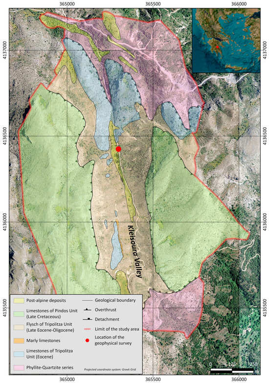 In Figure 3, the detailed geological map of the wider study area is presented, modified after [29], where the location to which the geophysical survey was applied is noted by the red mark.