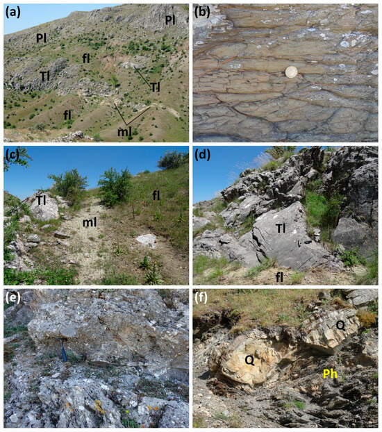 (a) General view of the west flank of the Kleisoura Valley where the “Arcadian nappe” (Pindos limestones—Pl) overlies the Tripolitza Unit; (b) close-up view of Tripolitza flysch (fl); (c,d) the transition from the Tripolitza limestones (Tl) to the flysch (fl) through transitional marly limestone (ml) beds (c) or high-angle fault (d); (e) thick tectonic breccia located at the structurally highest levels of the Tripolitza limestones; (f) Phyllite–Quartzite series: boudinaged light-colored quartzitic layers (Q) surrounded by gray–green phyllites (Ph).