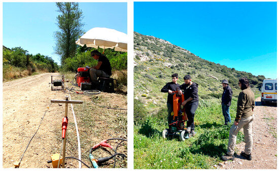 To investigate the geologically complex subsurface structure of the two study areas, we employed a multidisciplinary, near-surface geophysical approach, utilizing the electrical resistivity tomography (ERT), seismic refraction tomography (SRT) and ground penetrating radar (GPR) techniques. More specifically, the ERT and the SRT techniques were applied to both study areas (Figure 5), while the GPR technique was used exclusively in the study area of Plaka. Furthermore, all the geophysical measurements were topographically corrected using a GNSS system.