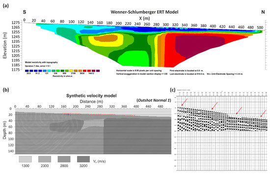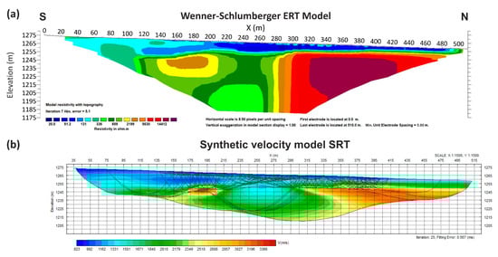 The creation of the synthetic seismic records was conducted using the Modeling 2D module, which incorporates the shortest path method [44] for forward modeling calculation. Seismic rays’ trajectories and corresponding travel times were calculated based on a predefined velocity model that was created taking into account the surface geological observations and the results of the ERT technique (Figure 8), given that it was the only available information regarding the subsurface structure for both study areas. Moreover, an initial subsurface velocity estimation was conducted by incorporating the intercept-time method in the field seismic records.