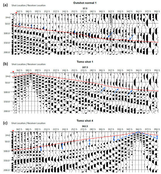 Superimposing of the synthetic first arrival times (red marks) on the field seismic records for the (a) outshot normal 1, (b) tomo shot 1 and (c) tomo shot 4 seismic source locations (Figure 6). The blow arrows and the blue dashed lines indicate the divergence between the synthetic and true first arrivals.