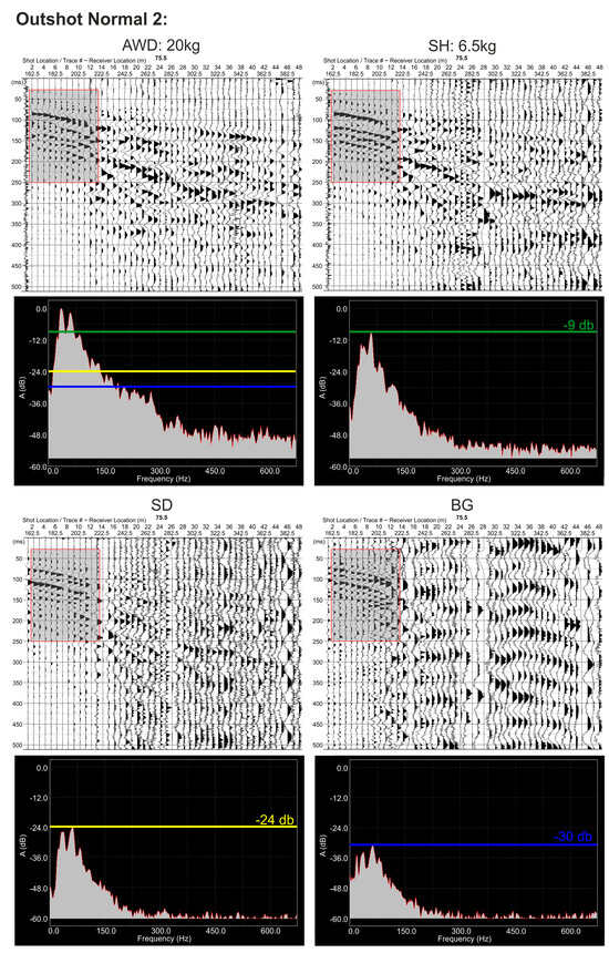 Seismic records along with their corresponding amplitude spectra acquired with four (4) different seismic sources at the outshot normal 2 source location (Figure 6). AWD: 20 kg—accelerated weight drop; SH: 6.5 kg—sledgehammer; SD—seismic detonator; BG—buffalo gun. The selected time window for the analysis is represented by the grey shaded box with red outline. The maximum energy amplitudes of the BG, SD and SH 6.5 kg sources are marked by the blue, yellow and green horizontal lines, correspondingly.