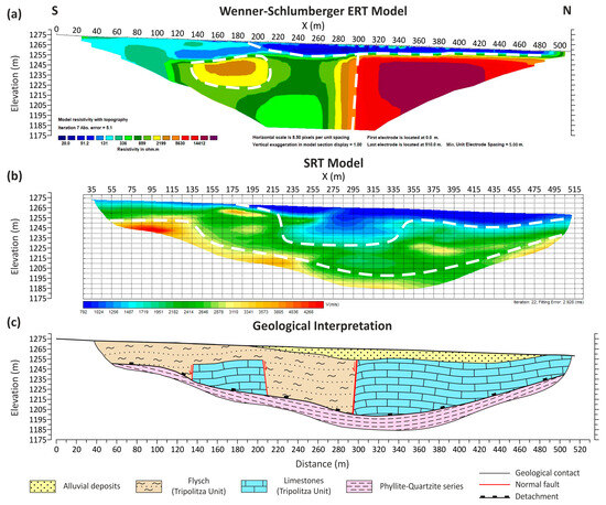 (a) ERT and (b) SRT profiles and their (c) geological interpretation derived from their combined evaluation for the first study area (Kleisoura Valley, Ano Doliana). The white dashed lines delimit formations with different geophysical parameters. The red arrow indicates the fault kinematics.