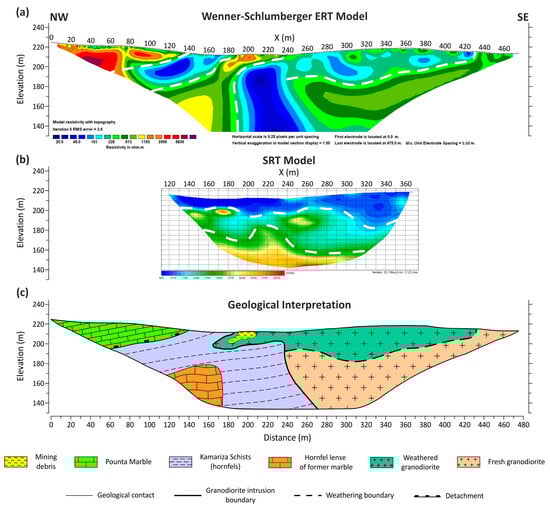 The final geological interpretation of the geophysical results is presented in Figure 12c, which was derived from the combined evaluation of the ERT and SRT techniques and taking into consideration the geological observations and data collected during the detailed geological mapping that was carried out in the area.