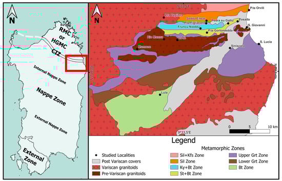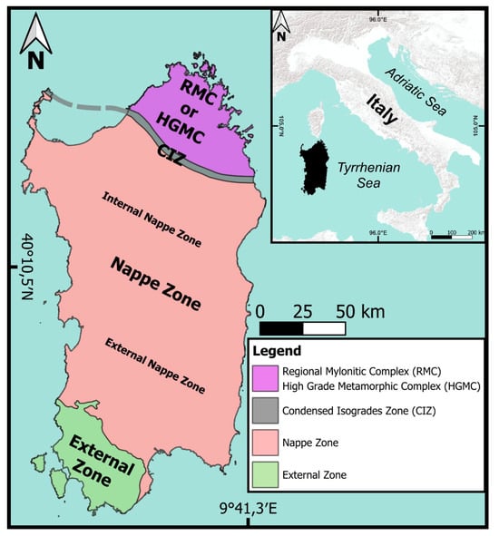 The Variscan region of Sardinia is categorized into four NW-SE trending tectono-metamorphic zones (Figure 1) with metamorphic grade intensifying toward the northeast [,,,,,,].