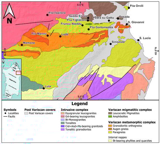 - Carmignani, L.; Oggiano, G.; Funedda, A.; Conti, P.; Pasci, S. The Geological Map of Sardinia (Italy) at 1:250,000 Scale. J. Maps 2016, 12, 826–835. [Google Scholar] [CrossRef]